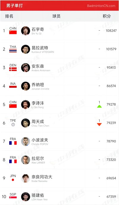 【男单】石宇奇1,李诗沣5(上升1),翁泓阳14(下滑3),陆光祖16(下滑1),王正行28(上升1),胡哲安62,朱轩辰68(下滑1),董天尧90(上升1),雷兰曦102(下滑20),周新宇104(下滑1),王子峻114(下滑3),孙超175,刘宇轩220(上升2),刘亮345(上升1)。