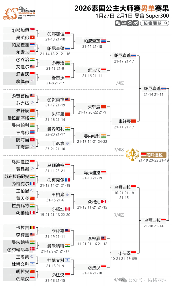 男单决赛,印尼小将乌拜迪拉21-19、20-22、21-19惊险战胜泰国小将帕尼查蓬,收获职业生涯首个Super300级别冠军。回想3个多月前,乌拜迪拉还在世青赛中不敌刘洋名宇,只拿到亚军,现如今刘洋名宇还没有机会出来打比赛,而昔日的对手已经登顶Super300冠军。