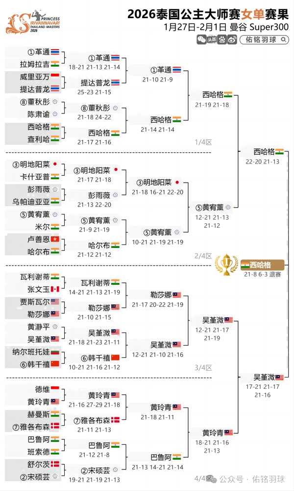 女单决赛,20岁的印度新人西哈格收获退赛大礼,前面几场比赛,连续经历3局苦战的马来西亚选手吴堇溦决赛状态不佳,首局8-21,第二局3-6时申请退赛。在此之前,西哈格参加了不少低级别国际赛、挑战赛,拿过多次冠军,而这次泰国大师赛夺冠,刷新了职业生涯新纪录。
