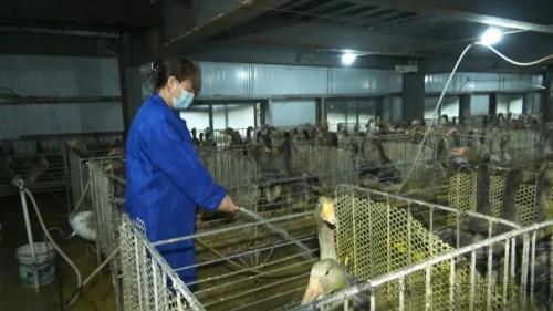 在霍邱县花园镇安业村的安徽牧康鹅业有限公司,员工刘雪梅正在进行朗德鹅喂养及养殖车间清扫工作。