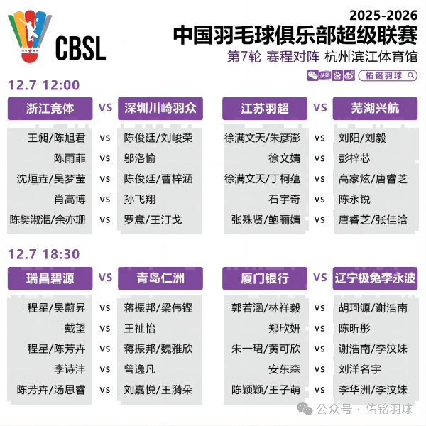 12月6日晚,2025-2026中国羽毛球俱乐部超级联赛结束在杭州滨江体育馆第6轮的争夺。晚上进行的两场比赛,青岛仁洲4-1战胜浙江竞体,厦门银行5-0横扫瑞昌碧源。