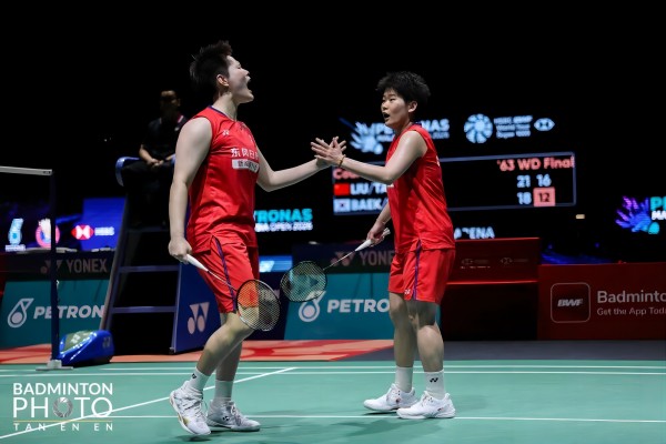 国羽女双头号种子刘圣书/谭宁在本站赛事中表现优秀。半决赛面对韩国组合郑那银/李妍雨,“圣坛”组合直落两局取胜,顺利闯入决赛。决赛中,她们再度迎战韩国强档白荷娜/李昭希——这也是两对组合自去年年终总决赛半决赛后的又一次关键对决。首局较量,刘圣书/谭宁开局稍显慢热,一度比分落后,但她们迅速稳住阵脚,凭借耐心周旋将比分追平。进入局歇时,对手仅以11比10领先一分。下半局,刘圣书/谭宁通过连贯的进攻与严密的控制拉开分差,最终以21比18先拔头筹。第二局,中国组合继续稳扎稳打,全程掌控节奏,最终21比12战胜对手,夺得新赛季首站顶级赛冠军。这也是她们继2024年后,再次在马来西亚公开赛女双项目上夺冠。