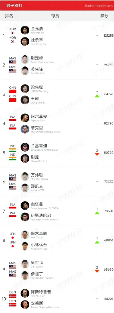 北京时间1月20日,世界羽联2026年第4周排名更新,上周结束印度羽毛球公开赛,国羽二金一银收官,梁王组合登顶,排名上升2位,重返前三。李诗沣再度跻身前5,翁泓阳下滑3位,处在前15边缘。赖浩俊上周跻身印度赛四强,排名创职业生涯新高来到第15。国羽本周男单、女双、混双三项制霸榜首,韩国则是在女单和男双项目上一骑绝尘。以下为国羽球员排名详情: