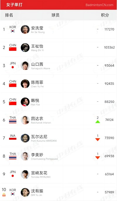 【女单】王祉怡2,陈雨菲4,韩悦5,高昉洁11,韩千禧38(下滑1),邬洛愉115(下滑2),蔡炎炎123(下滑1),徐文婧131,戴望228,张艺曼244(下滑1),郑欣妍258,罗盛萱268(下滑3),袁安琪277(下滑3),戴琴艺312(下滑3),杨菁蕊333(下滑2),阴伊晴466(下滑4)。
