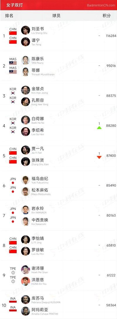 【混双】冯彦哲/黄东萍1,蒋振邦/魏雅欣2,郭新娃/陈芳卉6,程星/张驰16,高家炫/吴梦莹22(上升1),冯彦哲/魏雅欣43,朱一珺/张驰78(上升1),廖品逸/唐睿芝91(上升1),朱一珺/李茜94,蒋振邦/黄东萍137,李泓毅/鲍骊婧144,沈烜垚/杨嘉怡148(下滑2),李泓毅/黄可欣184。以下为最新排名情况: